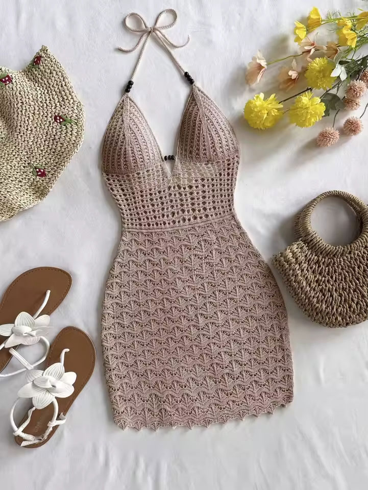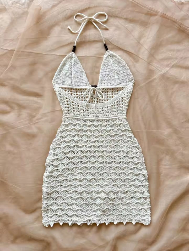 Abito estivo aderente con perline di legno scavate con scollo a V sexy. Abito lavorato a maglia senza schienale con cinturino per spaghetti da vacanza.